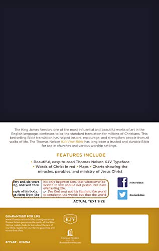The Thomas Nelson KJV Pew Bible has long been a trusted and durable Bible for use in churches and various worship settings. This edition is published in KJV Comfort Print type, which was designed exclusively for Thomas Nelson to be the most readable at any size.The classic King James Version, one of the most influential and beautiful works of art in the English language, continues to be the standard translation for numerous churches and millions of Christians. This bestselling Bible translation has helped inspire, encourage, and strengthen people from all walks of life.Invite your eyes to linger and engage God’s Word with new, easy-to-read Comfort Print® KJV Bibles from Thomas Nelson. Blending modern technology with old-world craftsmanship, Comfort Print® KJV Bibles are designed with exclusive fonts, reflecting the beautiful and timeless character of the King James translation, to enhance your scripture reading experience.Bullet points: Words of Christ in red help you quickly identify Jesus’ teachings and statements Miracles and parables of Jesus call out important events during Jesus’ earthly ministry Easy-to-read 9.2-point KJV Comfort Print