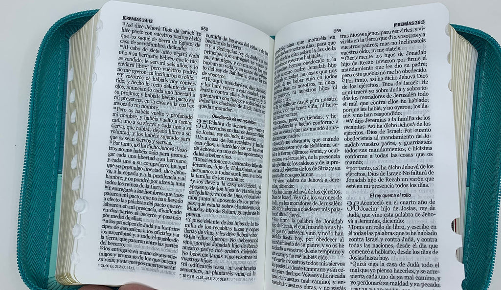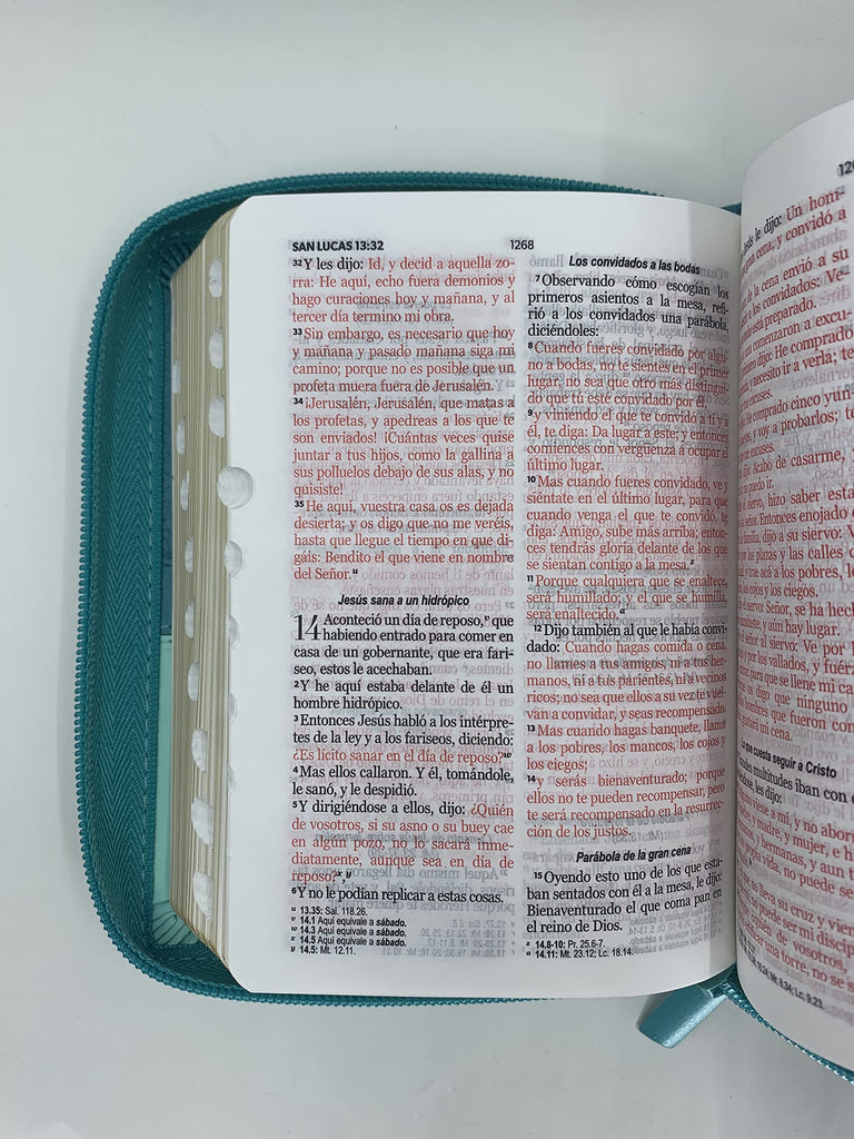 Reina Valera 1960, tamaño bolsillo (100x140 mm), I/piel turquesa/turquesa con índice y cierre, canto plateado palabras de Jesús en rojo. Concordancia amplia de palabras de la Biblia, concordancia personajes. 32 páginas a todo color con ayudas y esquemas. 12 mapas a todo color .Referencias cruzadas. Letra: 8,5 puntos.