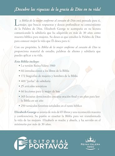¡Descubre las riquezas de la gracia de Dios en tu vida!Una edición especial limitada de la mejor Biblia Devocional para la mujer contemporánea. La «Biblia de la mujer conforme al corazón de Dios» es una Biblia que te informa e instruye, te inspira y edifica, y te deleita y ayuda cada día.Elizabeth ha integrado sus devocionales que cambian la vida, en una Biblia repleta de características adicionales diseñadas para llevarte a descubrir de nuevo el poder transformador de la Palabra de Dios.Los devocionales y recursos incluidos en la «Biblia de la mujer conforme al corazón de Dios» te informan e instruyen,te inspiran y edifican, te deleitan y ayudan cada día.El contenido ha probado su alto impacto y calurosa recepción entre las lectoras hispanoamericanas por casiuna década. Recursos relevantes y efectivos para las lectoras de hoy y puede usarse en conjunto con diarios interactivos. Entre sus distintos recursos de estudio se incluyen:• Texto de la versión Reina-Valera 1960• Introducciones a cada libro de la Biblia• 172 biografías de las principales mujeres y hombres de la Biblia• 25 artículos de sabiduría• 400 perlas de sabiduría• 365 lecturas devocionales diarias con una oración fin y un plan para leer la Biblia en un año• 250 versículos favoritos resaltados en el texto bíblico• Plan para memorizar 250 versículos bíblicos• Lecciones para la mujer de hoy• Cubierta novedosa, atractiva y durableLa «Biblia de la mujer conforme al corazón de Dios» refuerza su impacto personal al usarse en conjunto con el «Diario para la mujer conforme al corazón de Dios».