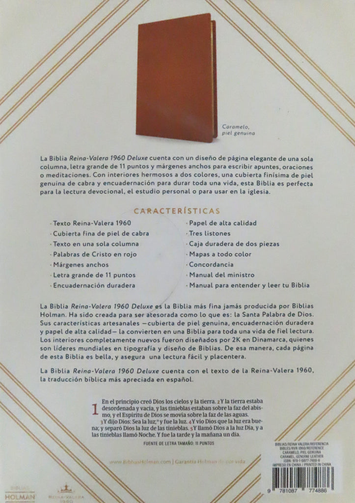 Nueva Biblia exclusiva RVR 1960 Biblia Deluxe Por primera vez, Biblias Holman lanza una Biblia de la más alta artesanal en la versión más popular, Reina Valera 1960. Cada Biblia de la Colección Bíblica Deluxe de Biblias Holman está creada para usarse con frecuencia y construida para perdurar a través de años de lectura fiel. Sus características artesanales incluyen cuero de grano natural con variaciones únicas en su grano y tono, costura smyth, papel de calidad y encuadernación con bordes forrados. Para garantizar la experiencia de lectura más fiel, la Biblia Deluxe incluye un tipo de letra exclusivo llamado BibleSerif, el más legible y cómodo en el mercado. Como resultado, la Biblia brinda a todos la experiencia de lectura más hermosa en el mercado español. La Colección Biblia Holman Deluxe está construida para durar toda la vida. Características: Biblia artesanal de la más alta calidad Cubierta de piel genuina de cabra de primera Texto bíblico en una sola columna Nueva fuente exclusiva: BibleSerif de 11 puntos (la más grande en el mercado de biblias de lujo) Papel grueso de la más alta calidad Encuadernación bordeada Manual de Ministro Como leer y entender la Biblia Historia Reina-Valera 1960 3 listones de colores combinados Mapas a todo color