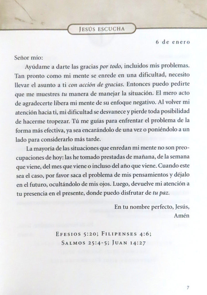Muchos de nosotros queremos orar más, pero no estamos seguros de qué decir. En este inspirador libro de oraciones devocionales de 365 días, Jesús escucha, Sarah Young, autora del best seller del New York Times, Jesús te llama, te ayuda a acercarte a Dios en todas las circunstancias a través de un año de oraciones diarias basadas en las Escrituras. Al orar las Escrituras a través de este libro de oraciones devocionales diarias, experimentarás cómo la oración intencional te conecta con Dios, cambia tu corazón e incluso mueve montañas. En este libro de oraciones diarias, Sarah Young ofrece oraciones honestas para los lectores que:han estado orando durante años pero anhelan renovar la comprensión bíblicaquieren orar las promesas de Dios directamente de las Escriturasestán pasando por tiempos difíciles, son nuevos en la fe y no están seguros de cómo comenzar a orarhan encontrado descanso espiritual en Jesús te llama y Jesús siempreestán ansiosos por comenzar una nueva disciplina espiritual significativaLa base bíblica de cada oración en Jesús escucha se da al final de cada entrada para que puedan volver continuamente a las promesas de Dios en las Escrituras. Este devocional incluye:un hermoso interior de un color365 días de oraciones basadas en la Bibliareferencias de las Escrituras con énfasis en palabras citadas directamente de la BibliaYa sea que Jesús escucha sea para regalar o para ti, para establecer una práctica de oración más consistente, las palabras de Sarah Young y su constante retorno a la Palabra de Dios enriquecerán tu vida de oración como nunca.Jesus ListensMany of us want to pray more, but we feel unsure of what to say. In this inspiring 365-day devotional prayer book, Jesus Listens, Sarah Young, author of the New York Times bestselling Jesus Calling, helps you come to God in all circumstances through a year of daily prayers based on the words of Scripture.By praying Scripture through Jesus Listens, you'll experience how intentional prayer connects you to God, changes your heart, and can even move mountains. In this daily devotional prayer book, Sarah Young offers honest prayers for readers who . . .have been praying for years but long for renewed biblical insightswant to pray God's promises straight from Scriptureare going through difficult times, are new to faith, and are not sure how to begin in prayerhave found spiritual rest in Jesus Calling and Jesus Alwaysare eager to start a meaningful new spiritual disciplineThe biblical basis for each prayer in Jesus Listens is given at the end of each entry so you can continually return to God's promises in Scripture. This devotional includes:a beautiful one-color interior365 days of Bible-based prayersscripture references with emphasis on words quoted directly from the BibleWhether you gift Jesus Listens or pick it up yourself to establish a more consistent prayer practice, Sarah Young's words and her constant return to the Word of God will enrich your prayer life like never before. About the Author Sarah Young, autora de los devocionales más vendidos, Jesús te llama y Jesús siempre, ha vendido más de 25 millones de libros en todo el mundo. Jesús te llama ha aparecido en las listas de los más vendidos. Los escritos de Sarah incluyen Jesús te llama, Jesús siempre, Jesús Hoy, Jesús vive, Jesús te llama para pequeñitos, Jesús te llama para Niños- Devocional, cada uno animando a los lectores en sus viajes hacia la intimidad con Cristo. Sarah y su esposo fueron misioneros en Japón y Australia durante muchos años. Actualmente viven en Estados Unidos.