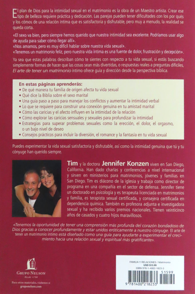 De una investigadora en sexualidad galardonada en dos ocasiones a nivel nacional, El arte de tener un matrimonio íntimo nos da un plan a seguir para experimentar el crecimiento hacia una relación sexual espiritual más gratificante.El plan de Dios para la intimidad sexual en el matrimonio es obra de un Maestro artista, y la verdadera intimidad es como una hermosa obra maestra. El arte de tener un matrimonio íntimo proporciona orientación y guía para temas como:Tu matrimonio va bien, pero quieres mejorar tu vida sexual y estás buscando ayuda para hacerlo.Quieres saber lo que Dios tiene que decir sobre cómo construir una intimidad sexual satisfactoria en tu matrimonio.Tu relación sexual ha estado llena de dolor, desaliento y frustración y necesitas algunas respuestas.Tienes algunos problemas médicos que dificultan las relaciones sexuales y te gustarías reavivar la experiencia sexual mutuamente placentera.Crear esa obra maestra puede significar conocer el punto de vista de Dios sobre el sexo, adquirir habilidades de intimidad que dan vida y descubrir cómo trabajar a través del conflicto de una manera que cree una conexión más profunda. También puede significar superar las cosas en tu pasado, sanar las cosas en tu matrimonio o lidiar con esos desafíos médicos.Podemos tener una comprensión más profunda del corazón amoroso de Dios a través de ser profundamente conocidos y vinculados eróticamente con nuestro cónyuge. The Art of an Intimate MarriageFrom a two-time nationally award-winning sexuality researcher, The Art of Intimate Marriage gives us a road map to experience growth toward a more rewarding, spiritual sexual relationship. God?s plan for sexual intimacy in marriage is the work of a Master artist, and genuine intimacy is like a beautiful masterpiece. The Art of Intimate Marriage provides direction and guidance for issues such as:Your marriage is going well, but you want to make your sex life better and you?re looking for help on how to do that.You want to know what God has to say about how to build a fulfilling sexual intimacy in your marriage.Your sexual relationship has been full of pain, discouragement, and frustration and you need some answers.You have some medical issues that are making sex difficult, and you would like to rekindle experiencing mutually pleasurable sex. Creating that masterpiece may mean learning God?s view of sex, gaining life-giving intimacy skills, and figuring out how to work through conflict in a way that creates deeper connection. It may also mean overcoming things in your background, healing things in your marriage, or dealing with those medical challenges. We have the opportunity to have a deeper understanding of God?s loving heart through being deeply known and erotically bonded with our spouse.About the AuthorTim y Jennifer Konzen tienen su hogar en San Diego, California. Juntos, enseñan internacionalmente y sirven en los ministerios de matrimonios, jóvenes y familias en San Diego. Tim se desempeña como diácono de la iglesia, es dueño de un negocio y trabaja como gerente de programas para una firma de defensa. Jennifer tiene un doctorado en psicología y es terapeuta matrimonial y familiar, terapeuta sexual certificada y consejera certificada en dependencia de sustancias químicas. También es profesora adjunta e investigadora de sexualidad galardonada a nivel nacional. Los Konzen han estado casados ??felizmente por más de 25 años y tienen cuatro hijos maravillosos.