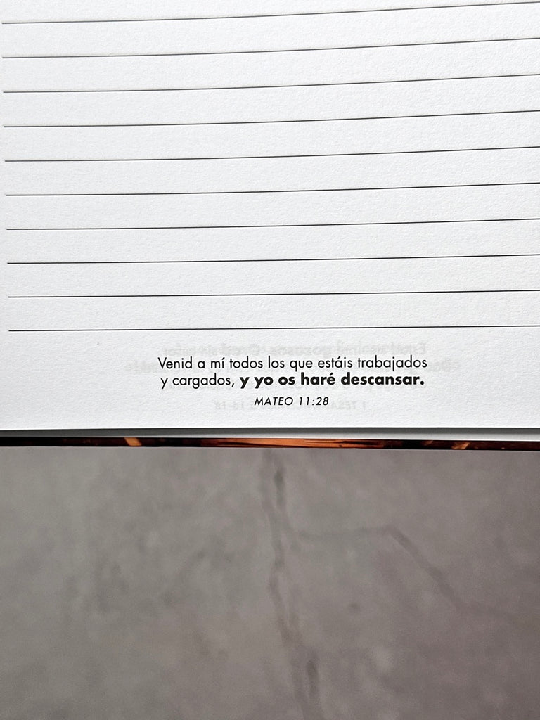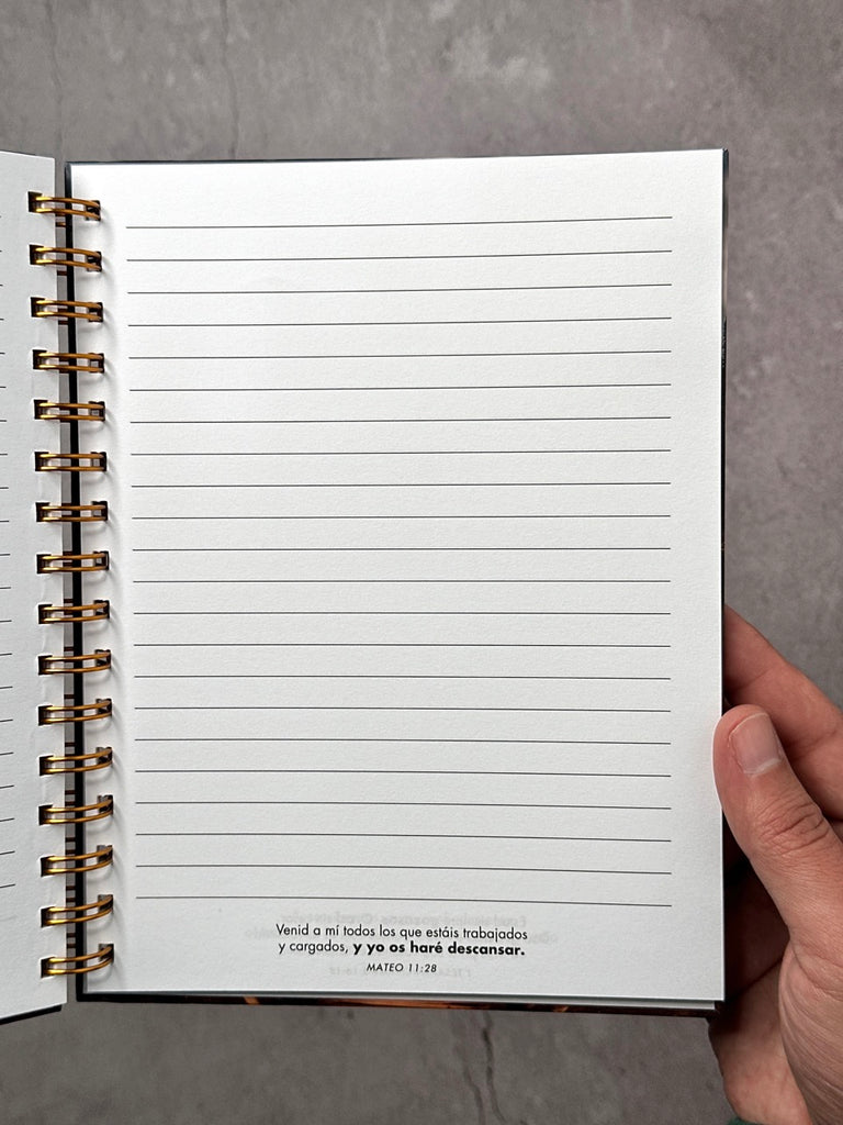 Librera de anillas Tapa Dura. Con efectos en la portada. Versículos en el interior. 192 páginas. Tamaño: 8.4” x 6.4” x 1” (213 x 163 x 25mm)