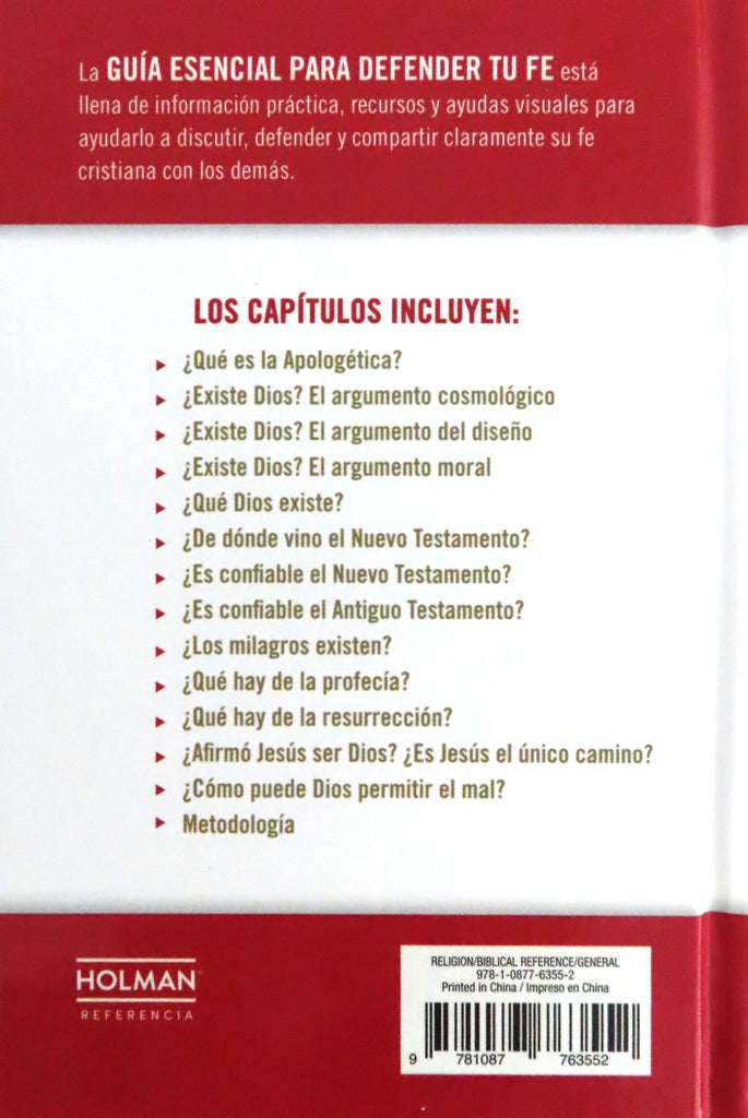 «La Guía definitiva para defender tu fe» está llena de información práctica, recursos y ayudas visuales para ayudarlo a discutir, defender y compartir claramente su fe cristiana con los demás.Los capítulos incluyen: ¿Qué es la Apologética? ¿Existe Dios? El argumento cosmológico ¿Existe Dios? El argumento teleológico ¿Existe Dios? El argumento moral ¿Qué Dios existe? ¿De dónde vino el Nuevo Testamento? ¿Es confiable el Nuevo Testamento? ¿Es confiable el Antiguo Testamento? ¿Ocurren milagros? ¿Qué pasa con la profecía? ¿La resurrección? ¿Afirmó Jesús ser Dios? ¿Es Jesús el único camino? ¿Cómo puede Dios permitir el mal?En una época de creciente relativismo moral y espiritual, muchas personas luchan contra la fiabilidad de las Escrituras, la historicidad de Jesús o el problema del dolor y el sufrimiento. Conocer los fundamentos de estas cuestiones y sus soluciones bíblicas te ayudará a entender la visión del mundo y las creencias de los demás y a defender tu fe de forma entretenida y atractiva.También disponible:Guía esencial sobre Tierra SantaGuía esencial de la BibliaGuía esencial sobre JesúsSíguenos y descubre más productos en la tienda de B&H Español.«The Ultimate Guide to Defend Your Faith» is full of practical information, resources, and visual aids to help you discuss, defend, and clearly share your Christian faith with others.Chapters include: What is Apologetics? Does God Exist? The Cosmological Argument Does God Exist? The Teleological Argument Does God Exist? The Moral Argument Which God Exists? Where Did the New Testament Come From? Is the New Testament Reliable? Is the Old Testament Reliable? Do Miracles Happen? What About Prophecy? The Resurrection? Did Jesus Claim to Be God? Is Jesus the Only Way? How Can God Allow Evil?In an age of increasing moral and spiritual relativism, many people struggle with the reliability of the Scriptures, the historicity of Jesus, or the problem of pain and suffering. Knowing the basics of these issues and their biblical solutions will help you understand the worldview and beliefs of others and defend your faith in a fun and engaging way.