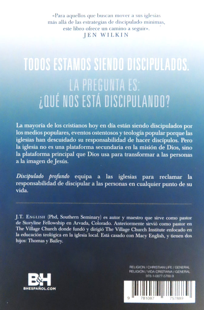 Todos somos discipulados. La verdadera pregunta es: ¿Qué nos está discipulando? La mayoría de los cristianos hoy en día son discipulados por medios populares, eventos ostentosos y teología tradicional porque las iglesias han descuidado su responsabilidad de hacer discípulos. Pero la iglesia no es una plataforma secundaria en la misión de Dios; es la plataforma principal que Dios usa para que Su pueblo crezca a la imagen de Jesús. Por lo tanto, como líderes en la iglesia, es nuestra responsabilidad principal establecer entornos y relaciones donde las personas puedan ser entrenadas, crecer y ser enviadas como discípulos. Hay tres elementos indispensables del discipulado: -Aprender a participar en la historia bíblica (la Biblia). -Crecer en nuestra confesión de quién es Dios y quiénes somos nosotros (teología). -Participar regularmente en acción intencional privada y corporativa (disciplinas espirituales).Discipulado profundo equipa a las iglesias a reclamar la responsabilidad de discipular a las personas en cualquier punto de su jornada. Everyone is being discipled. The question is: What is discipling us? The majority of Christians today are being discipled by popular media, flashy events, and folk theology because churches have neglected their responsibility to make disciples. But the church is not a secondary platform in the mission of God; it is the primary platform God uses to grow people into the image of Jesus. Therefore, as church leaders, it is our primary responsibility to establish environments and relationships where people can be trained, grow, and be sent as disciples. There are three indispensable elements of discipleship: -Learning to participate in the biblical story (the Bible). -Growing in our confession of who God is and who we are (theology). -Regularly participating in private and corporate intentional action (spiritual disciplines).Deep Discipleship equips churches to reclaim the responsibility of discipling people at any point on their journey. J. T. English (PhD) es autor y maestro y actualmente es el pastor principal de Storyline Fellowship en Arvada, Colorado. Anteriormente sirvió como pastor en The Village Church en Flower Mound, Texas, donde fundó y dirigió el instituto The Village, el cual está dedicado a la educación teológica en la iglesia local. Estudió una maestría en teología histórica en Dallas Theological Seminary y un doctorado en teología sistemática en Southern Seminary. está casado con Macy English y tienen dos hijos, Thomas y Bailey.J. T. English, PhD, is an author and teacher, and currently serves as the lead pastor of Storyline Fellowship in Arvada, CO. Previously, J.T. served as a pastor at The Village Church in Flower Mound, TX, where he founded and directed The Village Church Institute, which is committed to theological education in the local church. He received his ThM in Historical Theology from Dallas Theological Seminary and PhD in Systematic Theology from Southern Seminary. He is married to Macy English, and they have two children, Thomas and Bailey.