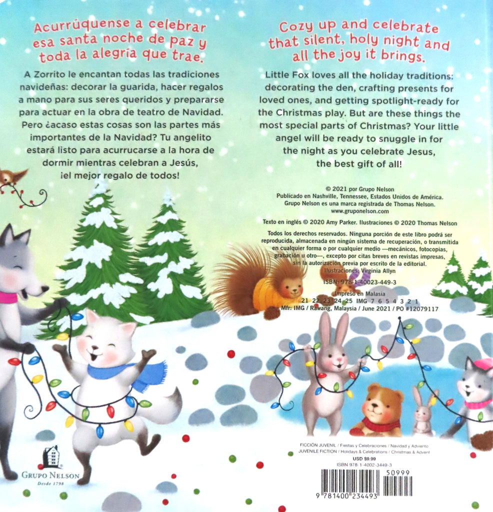 ¡Es la época de la alegría! Celebra la diversión familiar y las bendiciones de la temporada navideña con un joven zorro ártico mientras tu familia recuerda que Jesús es el mejor regalo de todos. Las encantadoras rimas de Amy Parker y las tiernas ilustraciones de Virginia Allyn hacen de Buenas noches, angelito - edición Bilingüe la lectura perfecta para niños pequeños y preescolares que disfrutan de la temporada navideña.Al pequeño zorro le encanta toda la emoción que trae la Navidad al bosque: hacer regalos creativos, colocar la estrella en el árbol y asegurarse de estar listo para ser el centro de atención en la gran obra de teatro navideña. Pero pronto se da cuenta de que el regalo perfecto ya ha sido dado por el bebé que llegó en la primera noche de Navidad.Este libro de cartón de Navidad de la exitosa marca de libros de cuentos para dormir Night Nightofrece a las familias una forma divertida de dar las buenas noches durante el tiempo de Advientocelebra los momentos especiales de las actividades navideñas en familiarecuerda suavemente a los niños que el Niño Jesús es el motivo de la temporadaEl tema navideño y la brillante cubierta hacen que Buenas noches, angelito - edición Bilingüe sea perfecto para un regalo de Adviento, para rellenar un calcetín o para sorprender a los padres, abuelos, maestros de la escuela dominical y amigos en la mañana de Navidad. Tu angelito estará listo para acurrucarse durante la noche mientras celebran juntos todas las bendiciones de la Navidad.Night Night Angel'Tis the season for joy! Celebrate the family fun and season's blessings of Christmas with a young arctic fox as your family remembers that Jesus is the best gift of all. Amy Parker's delightful rhymes and Virginia Allyn's sweet illustrations make Night Night, Angel - Bilingual edition the perfect read-aloud for toddlers and preschoolers enjoying the Christmas season.Little fox loves all the excitement that Christmas brings to the forest: making creative presents, placing the star on the tree, and making sure she is spotlight-ready for the big Christmas play. But soon she realizes that the perfect gift has already been given through the baby who arrived on the first Christmas night!This Christmas board book from the hugely successful Night Night bedtime storybook brandgives families a fun way to say goodnight during the Advent seasoncelebrates the special moments of family holiday activitiesgently reminds children that Baby Jesus is the reason for the seasonThe Christmas theme and sparkling cover make Night Night, Angel - Bilingual edition perfect for an Advent gift, stocking stuffer, or Christmas morning surprise from parents, grandparents, Sunday school teachers, and friends. Your little angel will be ready to snuggle in for the night as together you celebrate the many blessings of Christmas! About the Author Los libros para niños de Amy Parker han vendido más de 1 millón de copias, incluidos dos libros premiados Christian Retailing?s Best y los best sellers A Night Night Prayer, Night Night, Farm, y Night Night, Train.