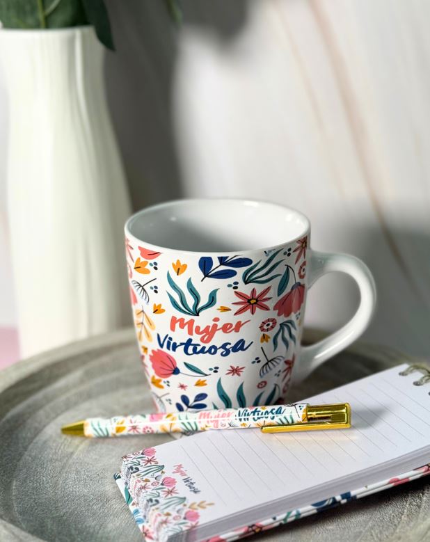 Incluye:- Taza: Capacidad de 12 oz, con asa pintada y un diseño en calcomanía a todo color. Fabricada en cerámica con un esmalte blanco que resalta su acabado elegante.- Libreta: Tamaño compacto (70 mm x 150 mm) con cubierta dura. Contiene 60 hojas de 95 gsm con impresión a todo color y diseños variados en su interior.- Bolígrafo: Diseño a juego con la libreta y la taza, agregando armonía y estilo al conjunto.