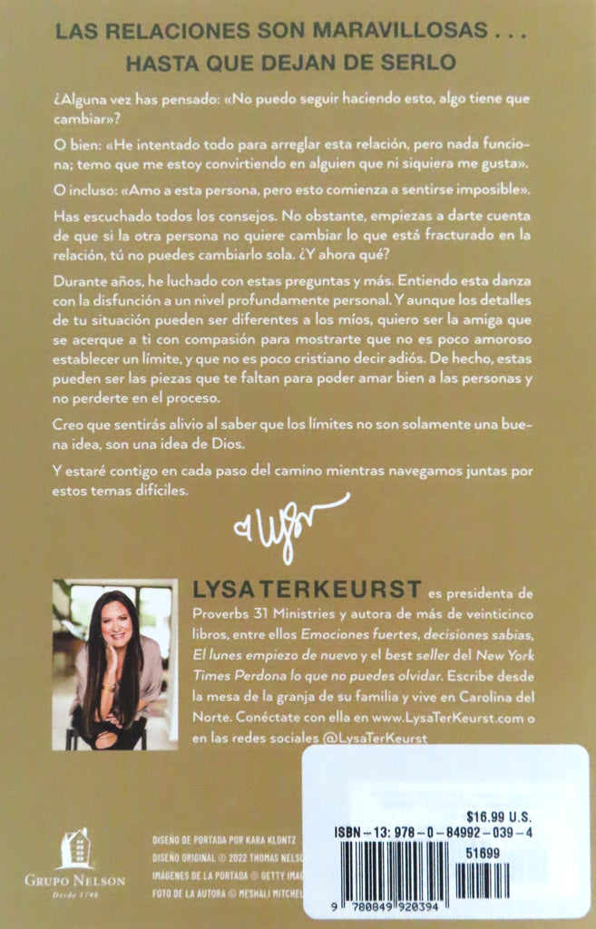 La autora número uno en ventas del New York Times, Lysa TerKeurst, ayuda a los lectores a detener la disfunción de las relaciones no saludables al mostrarles formas bíblicas de establecer límites y, cuando sea necesario, decir adiós, sin perder lo mejor de lo que son. Las relaciones son maravillosas. . . hasta que no lo son. ¿Alguna vez has pensado, no puedo seguir haciendo esto, algo tiene que cambiar? O bien, he intentado todo para arreglar esta relación, pero nada funciona. ¿Tengo miedo de convertirme en alguien que ni siquiera me gusta? ¿O incluso, amo a esta persona, pero esto comienza a sentirse imposible? Has escuchado todos los consejos. Pero estás empezando a darte cuenta de que si la otra persona no quiere cambiar lo que está roto en la relación, no puedes cambiarlo tú solo. ¿Y ahora que? Lysa TerKeurst entiende este baile con la disfunción y quiere ser su amiga perspicaz y compasiva que le enseñará que no es falta de amor establecer un límite, y que no es anticristiano decir adiós. Se sentirá aliviado al saber que los límites no son solo una buena idea, son una idea de Dios. Este libro revelador será refrescantemente útil para brindarle la sabiduría bíblica y la confianza para establecer límites que pueda mantener, comunicarlos y finalmente verlos trabajando en su vida. Good Boundaries and Goodbyes nació de las luchas personales de Lysa con los límites, una extensa investigación teológica y experiencias terapéuticas que transformaron la forma en que definió y persiguió las relaciones saludables. Lysa ahora está más comprometida que nunca con amar bien a las personas sin perder lo mejor de sí misma. Ella quiere ayudarte a hacer lo mismo.