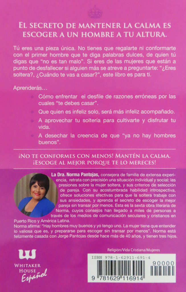 Tú eres una pieza única. No tienes que regalarte ni conformarte con el primer hombre que te diga palabras dulces, de quien tú digas que ?no es tan malo?. Si eres de las mujeres que están a punto de desfallecer si alguien más se atreve a preguntarte: ?¿Eres soltera?, ¿Cuándo te vas a casar??, este libro es para ti. Aprenderás?Cómo enfrentar el desfile de razones erróneas por las cuales ?te debes casar?. Que quien es infeliz solo, será más infeliz acompañado.A aprovechar tu soltería para cultivarte y disfrutar tu vida.A desechar la creencia de que ?ya no hay hombres buenos?.¡No te conformes con menos! Mantén la calma. ¡Escoge al mejor porque te lo mereces!You are a one-of-a-kind masterpiece. You don?t need to throw yourself into any man?s arms or settle for less than you deserve, only to end up telling people that he is ?not that bad.? If you feel like screaming whenever someone dares to ask, ?Are you still single? When are you finally getting married??, then this book is for you. You will learn?How to deal with all the wrong reasons for getting married.That if you are unhappy by yourself, you?ll end up feeling miserable with a Mr. Wrong.To enjoy your life while you wait.Yo dismiss the common belief that ?good men are an extinct species.?Do not settle for less! Keep calm. Choose Mr. Right because you deserve it! About the AuthorNorma Pantojas posee una maestría en Consejería de Familia y un doctorado en Consejería Cristiana. Está certificada como mediadora de conflictos y como árbitro en la solución de conflictos. Sus palabras y consejos han llegado a miles de hogares a través de medios escritos, radiales y televisivos.Norma Pantojas has a master?s degree in family counseling, and a doctorate in Christian counseling. She is certified as a conflict mediator and as an arbitrator in conflict management. Her words and counseling have touched thousands of homes, through books and other media.